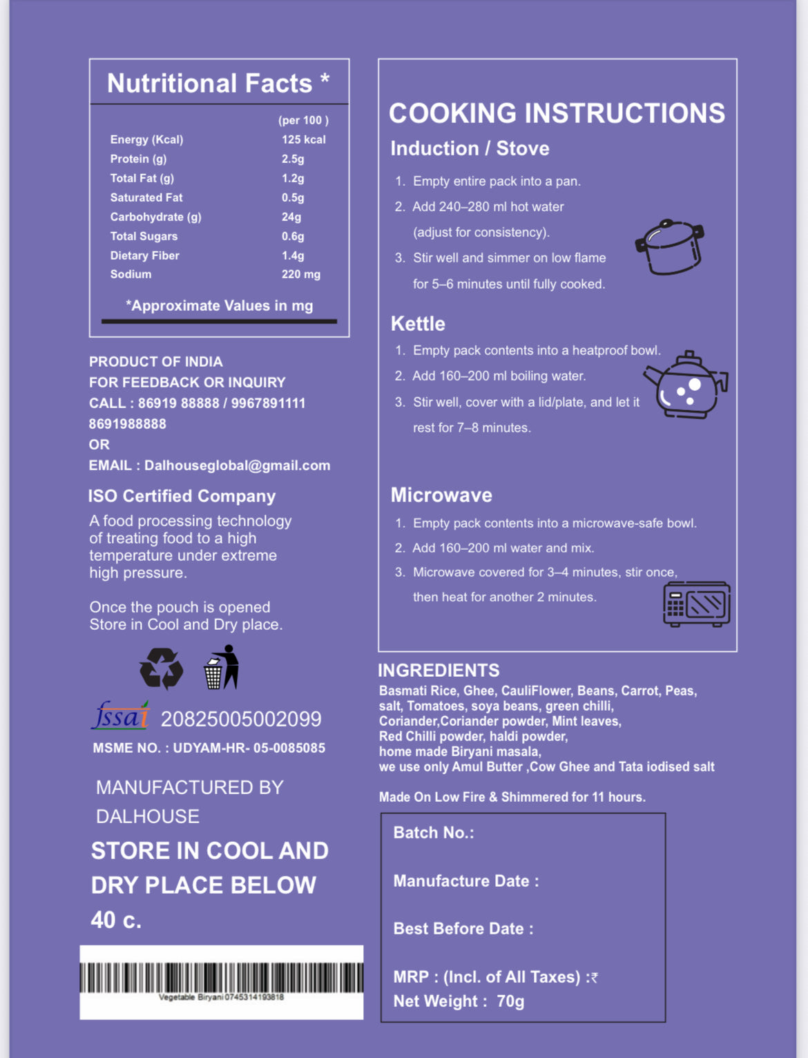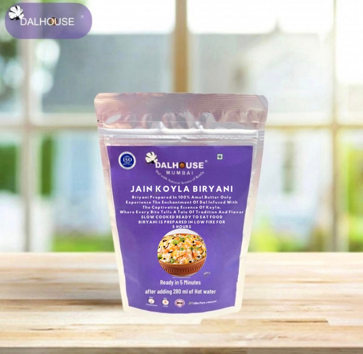 Relish the royal taste of Hyderabad with DALHOUSE Jain Koyla Biryani — a fragrant, vegetarian biryani slow-cooked on a low flame for 5 hours and infused with the natural aroma of Koyla (charcoal). Made in 100% Amul Butter and Cow Ghee, this biryani delivers authentic flavors without a drop of oil or preservatives. 100% Jain, 100% pure, and ready in just 5 minutes.