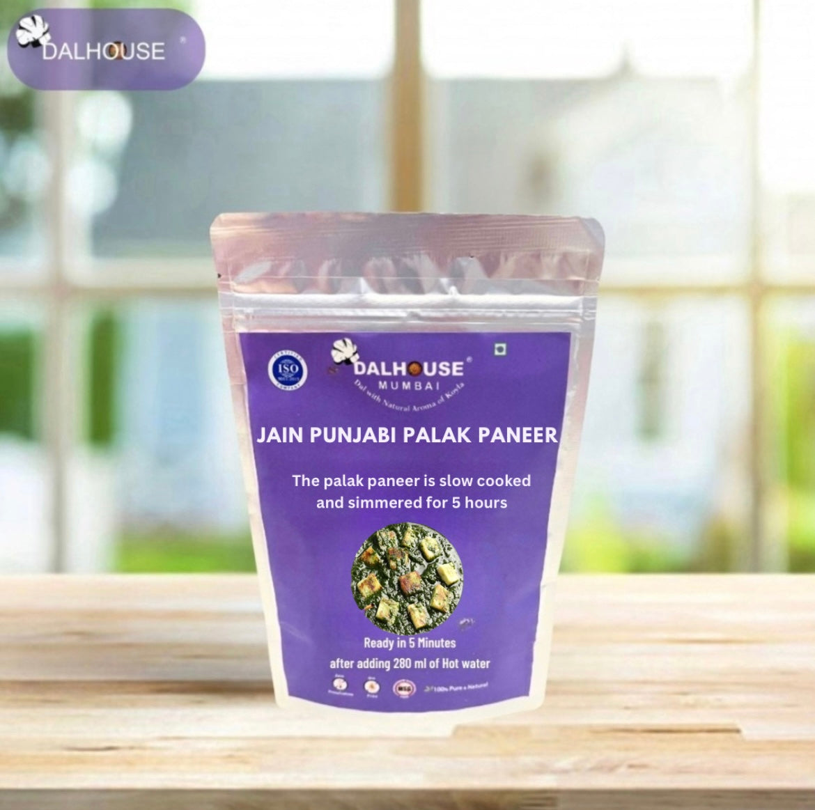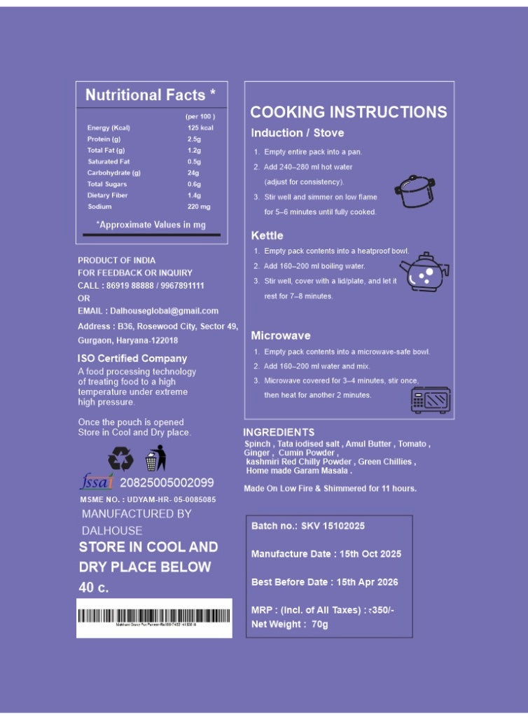 Just add hot water, mix well, and enjoy your perfectly balanced Jain Palak Paneer — smooth, mild, and full of real flavors.