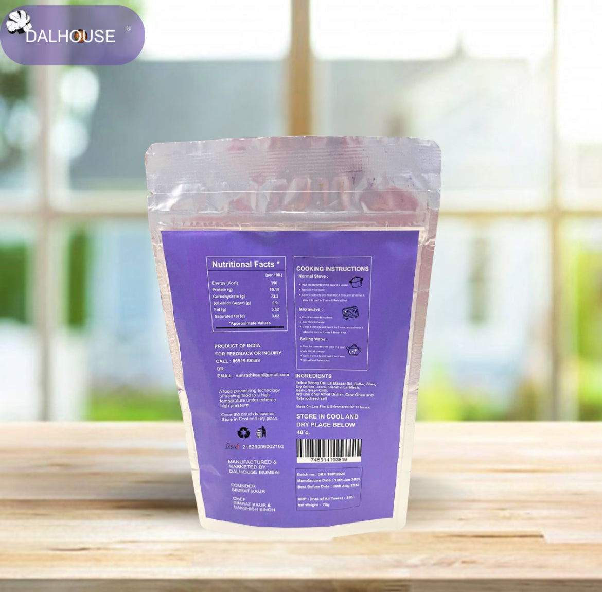Yellow Moong Dal, Lal Masoor Dal, Butter, Ghee, Onion, Garlic, Jeera, Kashmiri Lal Mirch, Green Chilli, Tata Iodised Salt.